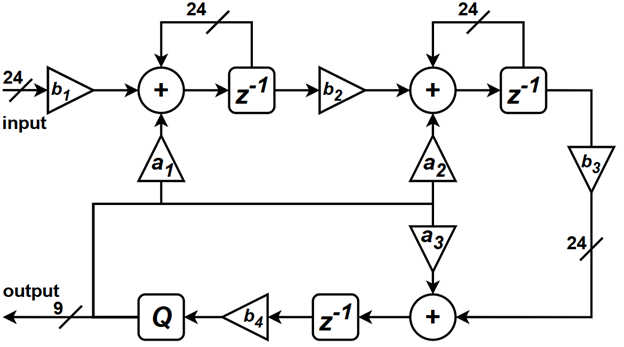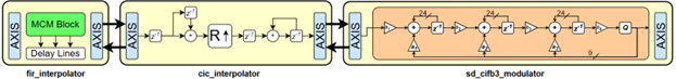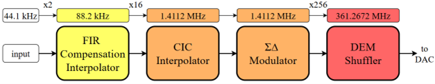 The interpolation of slow audio data into a high-speed modulator domain typically demands digital filters with a high density of arithmetic operations, requiring high amounts of silicon real estate and generating a deep critical logic path. First, the input data is passed through an Interpolation Filter, which elevates the sampling frequency and filters the spectral images present at integer multipliers of the input signal’s Nyquist frequency. Hi-fi audio input files are 24-bit, which is needlessly high for accurate sound reproduction, so the input data might be truncated. Afterwards, the DSM reduces the number of bits to an even lower level, often 1-bit, but retains the required ENOB by noise-shaping the quantization error. Finally, the DAC transforms the digital data into an analog waveform and the reconstruction filter removes the shaped noise and remaining spectral images, delivering an accurate representation of the input data.